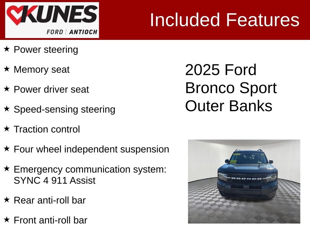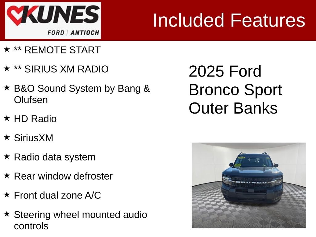 I got a 2025 Big Bend with the black diamond off road package. The steel modular front and rear in combination with bush guard gives this year model. A very aggressive off road look. With the ability to easily mount accessories and power them with the factory installed auxiliary switches. Hitch receiver seamlessly mounted into the rear steel bumper flanked by some very chunky recovery points. The upgraded aluminum rims wrapped with Continental all-terrains. It make this the most capable bronco sport yet. The interior of the 2025 has been updated with a new 13 inch touchscreen with Android Auto and apple car play. The lines of the dash flow elegantly from the new infotainment screen to the new all digital 12 inch gauge chaster. Toggling through the different modes on the gauge chaster is very intuitive, and all the displays are laid out very cleanly. Moving from gauge chaster the center storage cubby just below the infotainment screen there is a wireless charger and USB/ USB-c ports. The passenger side of that same cubby gets a handle and a matching one on the roof just in case the driver bucks a little too much. The passenger also gets a mesh storage area. That leads us to the fact this vehicle has tons of storage options all throughout. You have pockets on the sides of the front two seat big enough for the latest new phones. Very generous door storage on all four doors plus huge glove box and center console with 12 volt outlet. The back side of the center console has air vents and another 12 volt outlet plus a 110 outlet. Now getting to the cargo area it is massive for a crossover SUV. With off road package you get a cargo management system and a very nice rubber mat. Under that there is a full size tire plus scissor jack and funnel to use with the capless filler system. On the liftgate there isa pair of very bright led lights turned on with a switch in the cargo area. This feature packed vehicle has tons awesome gadgets and hidden a little homages I spend all day just talk that. At the end of the day it is car. So how does it drive. It is wonderful, the steering and pedal response is beautiful. Rides very smooth and little to no road noise going down the highway. The active cruise control and co-pilot 360 have been very handy. The car literally drives itself most of the time. There is not enough good things I could same about this car. I love it and you pick one too. You will see what I mean.… - 5.0