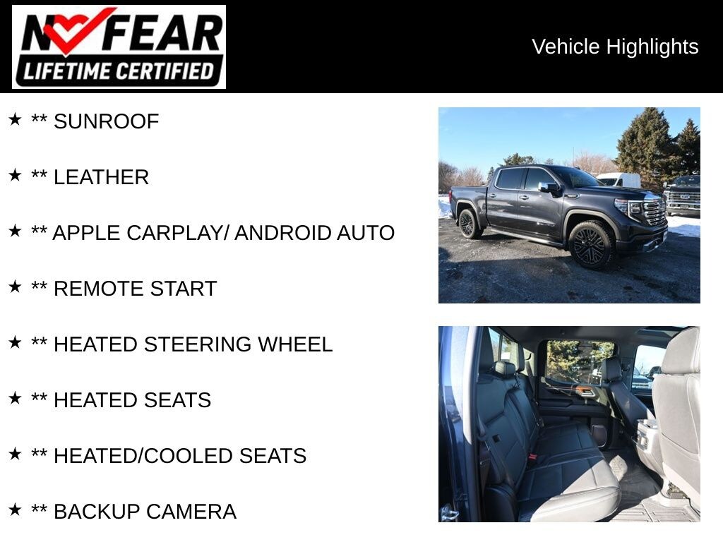 ** SUNROOF, ** LEATHER, ** APPLE CARPLAY/ ANDROID AUTO, ** REMOTE START, ** HEATED STEERING WHEEL, ** HEATED SEATS, ** HEATED/COOLED SEATS, ** BACKUP CAMERA, ** NAVIGATION, ** REAR PARK ASSIST, ** BLUETOOTH, ** ADAPTIVE CRUISE, 10-Speed Automatic, 4WD, Jet Black Leather, 120-Volt Bed Mounted Power Outlet, 120-Volt Instrument Panel Power Outlet, 2 Charge/Data USB Ports Inside Center Console, 2 Type-C Charge-Only Rear USB Ports, 2 USB Ports, 7 Speakers, Adaptive suspension, Alloy wheels, AM/FM radio, Apple CarPlay/Android Auto, Auto-dimming door mirrors, Automatic Emergency Braking, Auxiliary External Transmission Oil Cooler, Bed View Camera, Buckle to Drive, Bumpers: body-color, CarbonPro Fender Hard Badge, Chrome Header w/Signature Denali Chrome Grille, Chrome Recovery Hooks, Chrome Wheel To Wheel Assist Steps, Color-Keyed Carpeting Floor Covering, Compass, Delay-off headlights, Denali Premium Suspension w/Adaptive Ride Control, Electrical Steering Column Lock, Emergency communication system: OnStar and GMC connected services capable, Floor-Mounted Center Console, Forge Perforated Leather Seat Trim, Front anti-roll bar, Front Bucket Seats, Front Center Armrest, Front Pedestrian Braking, Front Rainsensing Wipers, Front reading lights, Front wheel independent suspension, Fully automatic headlights, Garage door transmitter, Genuine wood console insert, Genuine wood door panel insert, Genuine wood inserts, GMC MultiPro Power Steps, HD Surround Vision, Heated Driver & Front Outboard Passenger Seating, Heated front seats, Hill Descent Control, Hitch Guidance, Hitch Guidance w/Hitch View, Illuminated entry, In-Vehicle Trailering App, Integrated Trailer Brake Controller, Keyless Open & Start, LED Cargo Area Lighting, Low tire pressure warning, MultiPro Audio System by Kicker (LPO), OnStar & GMC Connected Services Capable, Outside temperature display, Overhead console, Panic alarm, Passenger door bin, Passenger vanity mirror, Perimeter Lighting, Power door mirrors, Power Front Passenger Windows w/Express Up/Down, Power Front Windows w/Driver Express Up/Down, Power passenger seat, Power Rake & Telescoping Steering Column, Power Rear Windows w/Express Down, Premium Bose 7-Speaker Sound System, Push Button Start, Radio data system, Radio: Premium GMC Infotainment Audio System, Rain sensing wipers, Rear Camera Mirror, Rear Cross Traffic Braking, Rear Pedestrian Detection, Rear reading lights, Rear seat center armrest, Rear step bumper, Remote keyless entry, Security system, SiriusXM w/360L, Speed control, Speed-sensing steering, Split folding rear seat, Steering wheel mounted audio controls, Tachometer, Telescoping steering wheel, Theft Deterrent System (Unauthorized Entry), Tilt steering wheel, Trailer Camera Provisions, Trailer Side Blind Zone Alert, Trip computer, Ultrasonic Front & Rear Park Assist, Universal Home Remote, Variably intermittent wipers, Ventilated Driver & Front Passenger Seats, Ventilated front seats, Voltmeter, Wheel Locks (Set of 4) (LPO), Wheels: 22" x 9" Painted Aluminum, Wi-Fi Hotspot Capable, Wireless Charging.