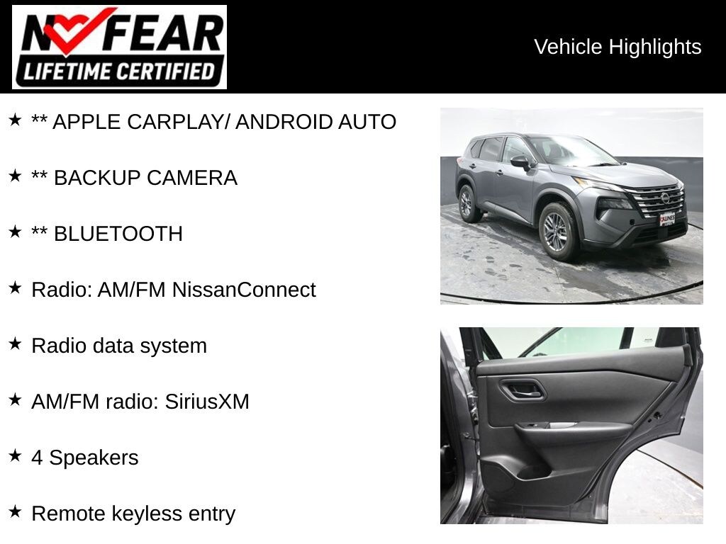 ** APPLE CARPLAY/ ANDROID AUTO, ** BACKUP CAMERA, ** BLUETOOTH, AWD, 4 Speakers, Alloy wheels, AM/FM radio: SiriusXM, Bumpers: body-color, Cloth Seat Trim, Delay-off headlights, Driver door bin, Driver vanity mirror, Dual front side impact airbags, First Aid Kit, Four wheel independent suspension, Front Bucket Seats, Front Center Armrest, Front reading lights, Illuminated entry, Knee airbag, Outside temperature display, Overhead airbag, Overhead console, Panic alarm, Passenger door bin, Passenger vanity mirror, Power door mirrors, Power steering, Power windows, Radio data system, Radio: AM/FM NissanConnect, Rear Parking Sensors, Rear seat center armrest, Remote keyless entry, Speed control, Split folding rear seat, Spoiler, Steering wheel mounted audio controls, Tachometer, Telescoping steering wheel, Tilt steering wheel, Trip computer.