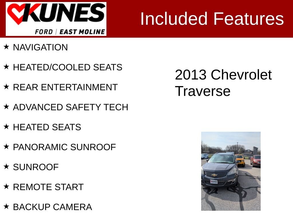 2013 Chevrolet Traverse LTZ Cyber Gray Metallic 3.6L V6 SIDI Clean CARFAX. NAVIGATION, HEATED/COOLED SEATS, REAR ENTERTAINMENT, ADVANCED SAFETY TECH, HEATED SEATS, PANORAMIC SUNROOF, SUNROOF, REMOTE START, BACKUP CAMERA, SIRUS/XM RADIO, REAR PARK ASSIST, WELL KEPT INSIDE AND OUT, ** BACK UP CAMERA, AWD, Emergency communication system: OnStar Directions & Connections. Odometer is 6410 miles below market average!