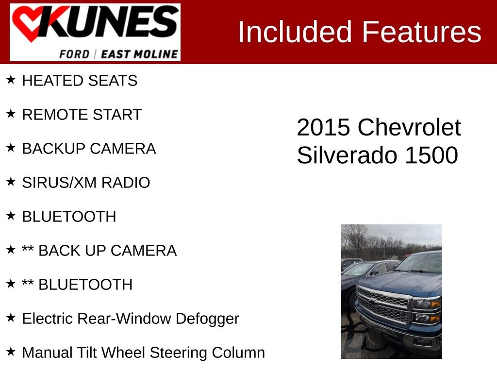 2015 Chevrolet Silverado 1500 LT Deep Ocean Blue Metallic EcoTec3 5.3L V8 HEATED SEATS, REMOTE START, BACKUP CAMERA, SIRUS/XM RADIO, BLUETOOTH, ** BACK UP CAMERA, ** BLUETOOTH, 6-Speed Automatic Electronic with Overdrive, 4WD, Dark Ash With Jet Black Interior Accents Cloth, Body Color Bodyside Moldings, Body Color Door Handles, Body-Color Mirror Caps, Body-Color Power Adjustable Heated Outside Mirrors, Bodyside moldings, Dual front side impact airbags, Electric Rear-Window Defogger, Front anti-roll bar, Front Chrome Bumper, Front wheel independent suspension, Manual Tilt Wheel Steering Column, Manual Tilt/Telescoping Steering Column, Occupant sensing airbag, Overhead airbag, Rear Chrome Bumper, Rear reading lights, Rear step bumper, Rear Wheelhouse Liners, Speed-sensing steering.