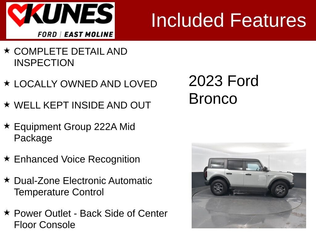 2023 Ford Bronco Big Bend Cactus Gray 2.3L EcoBoost I-4 CARFAX One-Owner. Clean CARFAX. COMPLETE DETAIL AND INSPECTION, LOCALLY OWNED AND LOVED, WELL KEPT INSIDE AND OUT, 2-Door Intelligent Access w/Lock/Unlock, ABS brakes, Ambient Footwell Lighting, Auto-Dimming Interior Rear-View Mirror, Compass, Connected Navigation, Dr & Pass Illuminated Sliding Visor Vanity Mirrors, Dual-Zone Electronic Automatic Temperature Control, Electronic Stability Control, Enhanced Voice Recognition, Equipment Group 222A Mid Package, Front Row Heated Seats, Heated door mirrors, Illuminated entry, Low tire pressure warning, Power Outlet - Back Side of Center Floor Console, Rear Parking Sensors, Remote keyless entry, Remote Start System, Traction control. Odometer is 9332 miles below market average!