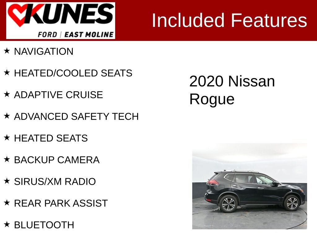 2020 Nissan Rogue SV Magnetic Black Pearl 2.5L I4 DOHC 16V NAVIGATION, HEATED/COOLED SEATS, ADAPTIVE CRUISE, ADVANCED SAFETY TECH, HEATED SEATS, BACKUP CAMERA, SIRUS/XM RADIO, REAR PARK ASSIST, BLUETOOTH, ** APPLE CARPLAY / ANDROID AUTO, ** BACK UP CAMERA, ** BLUETOOTH, AWD, 17" Aluminum Alloy Wheels, 18" Aluminum Alloy Wheels, 6.386 Axle Ratio, Anti-whiplash front head restraints, Cloth Seat Trim, First Aid Kit, Floor Mats & 2-PC Cargo Area Protector, Front anti-roll bar, Front Center Armrest w/Storage, Illuminated entry, Illuminated Kick Plates, Intelligent Cruise Control, Leather Shift Knob, Overhead console, Passenger door bin, Premium Package, ProPILOT Assist, Radio data system, Radio: AM/FM/CD/AUX, Radio: AM/FM/CD/AUX NissanConnect w/Navigation, Rear anti-roll bar, Speed-sensing steering, Spoiler, Trip computer, Turn signal indicator mirrors, Variably intermittent wipers. 25/32 City/Highway MPG
