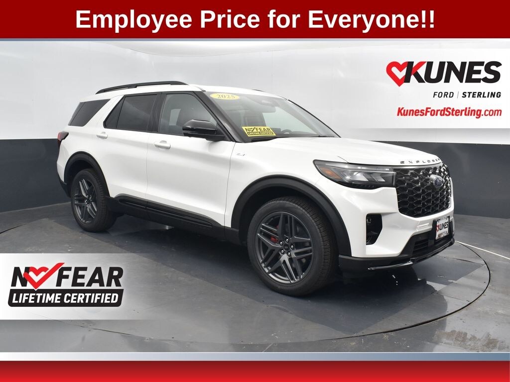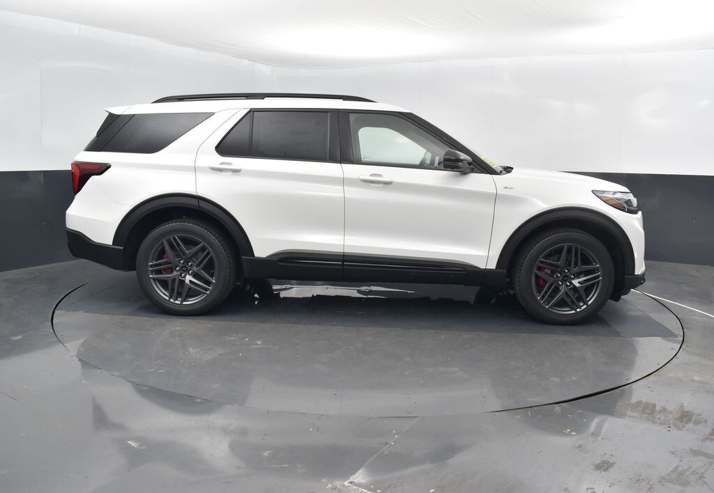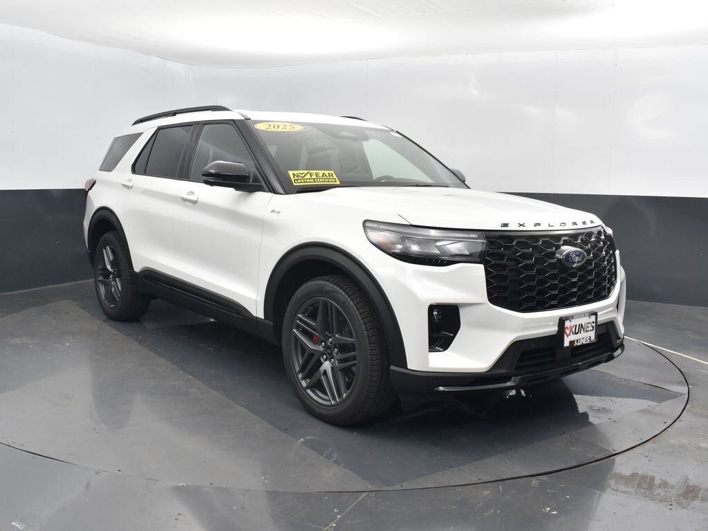 White 2025 Ford Explorer ST-Line 4WD, 10 Speakers, 3.58 Non-Limited Slip Rear Axle, 3rd row seats: bench, 4-Wheel Disc Brakes, ABS brakes, Air Conditioning, Alloy wheels, AM/FM radio: SiriusXM with 360L, Apple CarPlay/Android Auto, Auto High-beam Headlights, Automatic temperature control, Brake assist, Bumpers: body-color, Compass, Delay-off headlights, Driver door bin, Driver vanity mirror, Dual front impact airbags, Dual front side impact airbags, Electronic Stability Control, Emergency communication system: 911 Assist, Exterior Parking Camera Rear, Four wheel independent suspension, Front anti-roll bar, Front Bucket Seats, Front Center Armrest, Front dual zone A/C, Front fog lights, Front reading lights, Fully automatic headlights, Garage door transmitter, Heated door mirrors, Heated front seats, Heated steering wheel, Heated Unique Cloth Captain's Chairs, Illuminated entry, Knee airbag, Leather steering wheel, Low tire pressure warning, Navigation System, Occupant sensing airbag, Outside temperature display, Overhead airbag, Overhead console, Panic alarm, Passenger door bin, Passenger vanity mirror, Power door mirrors, Power driver seat, Power Liftgate, Power passenger seat, Power steering, Power windows, Radio: B&O Sound System by Bang & Olufsen, Rear air conditioning, Rear anti-roll bar, Rear reading lights, Rear window defroster, Rear window wiper, Remote keyless entry, Security system, Speed control, Speed-sensing steering, Speed-Sensitive Wipers, Split folding rear seat, Spoiler, Steering wheel mounted audio controls, Tachometer, Telescoping steering wheel, Tilt steering wheel, Traction control, Trip computer, Variably intermittent wipers, Wheels: 20" Ebony-Painted Machined Aluminum, 4WD. 20/27 City/Highway MPG