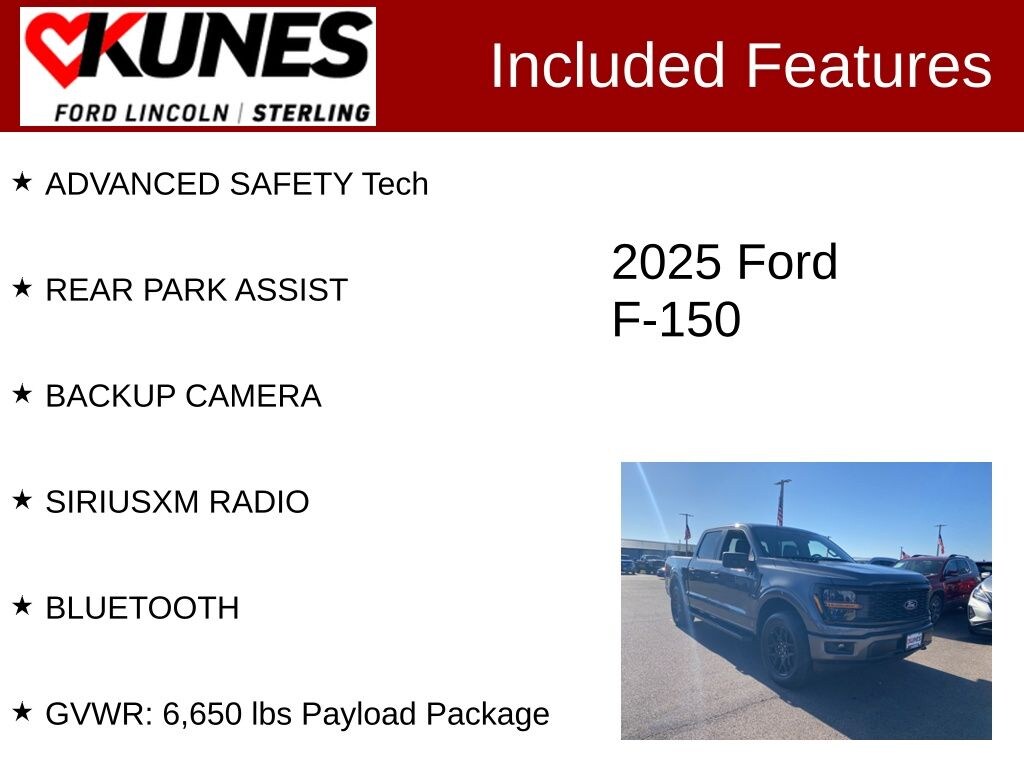 The 2025 F-150 gives you all the passenger and storage space you need along with a fantastic 24 MPG highway! Also included with every new vehicle: LIFETIME "NO FEAR" WARRANTY and AT HOME COURTESY DELIVERY! Call us for full details! We pride ourselves on honesty and integrity, but please note that mistakes or misprints due to human error are possible. Find out why our dealerships have won DealerRater.com DEALER OF THE YEAR a whopping 10 TIMES! Call, email, or live chat with one of our friendly sales professionals now to schedule your test drive! Prices shown do not include taxes, license, and title fees and a $367.70 documentary service fee, and $399 Security Fee.