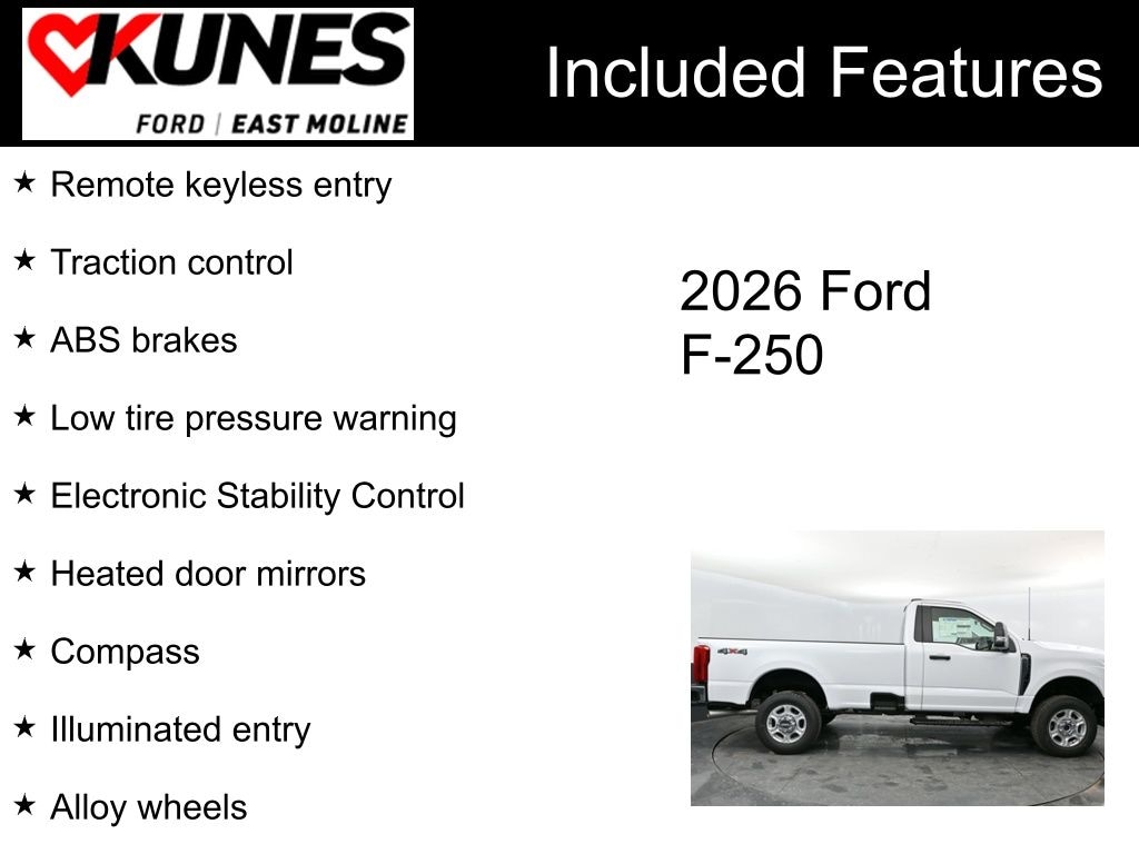 Oxford White 2026 Ford F-250SD XLT 4WD 10-Speed Automatic 7.3L V8 PFI SOHC 16V Federal 405hp 4WD, ABS brakes, Alloy wheels, Compass, Electronic Stability Control, Heated door mirrors, Illuminated entry, Low tire pressure warning, Remote keyless entry, Traction control.