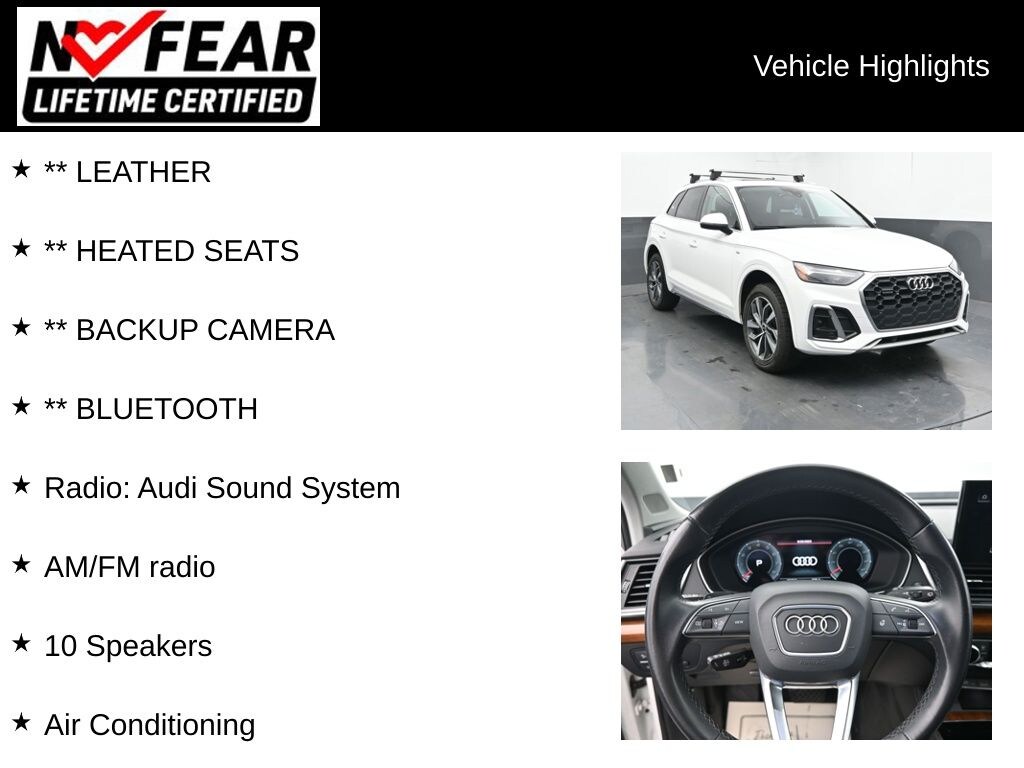 2023 Audi Q5 45 S line Premium quattro 2.0L Turbocharged 7-Speed Automatic S tronic quattro Clean CARFAX. CARFAX One-Owner. 22/29 City/Highway MPG