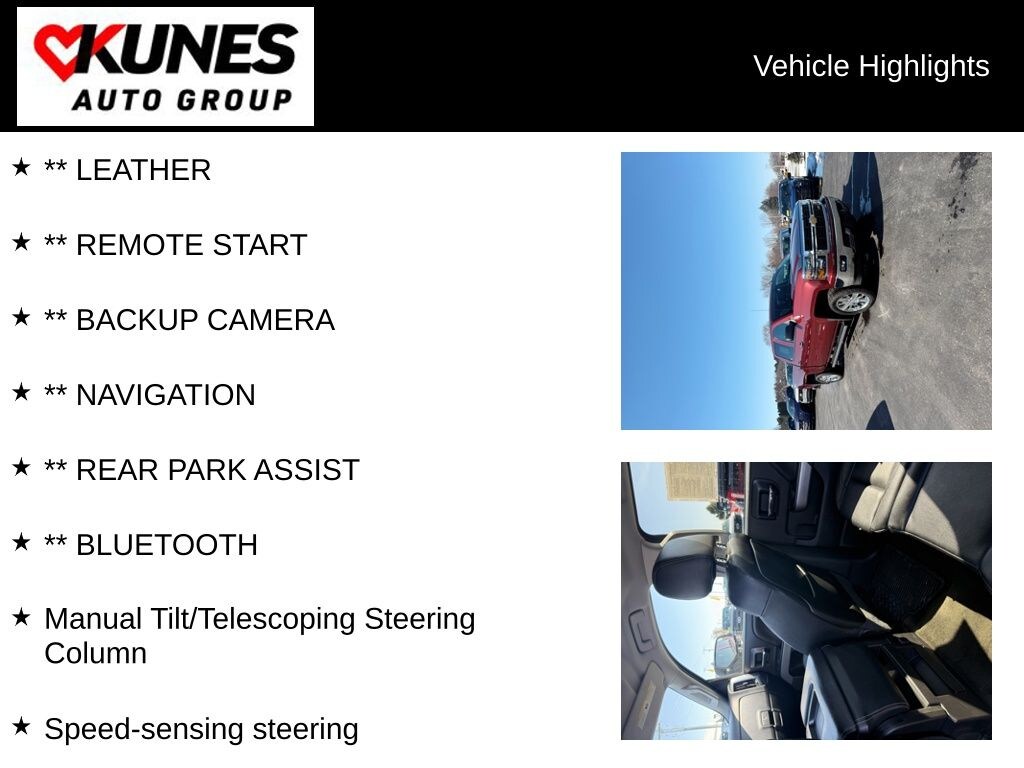 ** LEATHER, ** REMOTE START, ** BACKUP CAMERA, ** NAVIGATION, ** REAR PARK ASSIST, ** BLUETOOTH, 6-Speed Automatic Electronic with Overdrive, 4WD, Jet Black w/Leather Appointed Seat Trim, 10-Way Power Driver's Seat Adjuster, 150 Amp Alternator, 3.08 Rear Axle Ratio, 40/20/40 Front Split Bench Seat: Room For 6!!!, Bumpers: chrome, Delay-off headlights, EZ Lift & Lower Tailgate, Front anti-roll bar, Front Center Armrest w/Storage, Front Chrome Bumper, Front wheel independent suspension, Manual Tilt/Telescoping Steering Column, Overhead airbag, Overhead console, Rear 60/40 Folding Bench Seat (Folds Up), Rear Chrome Bumper, Rear reading lights, Rear seat center armrest, Rear step bumper, Rear Vision Camera w/Dynamic Guide Lines, Rear Wheelhouse Liners, Speed-sensing steering, Ultrasonic Rear Park Assist.