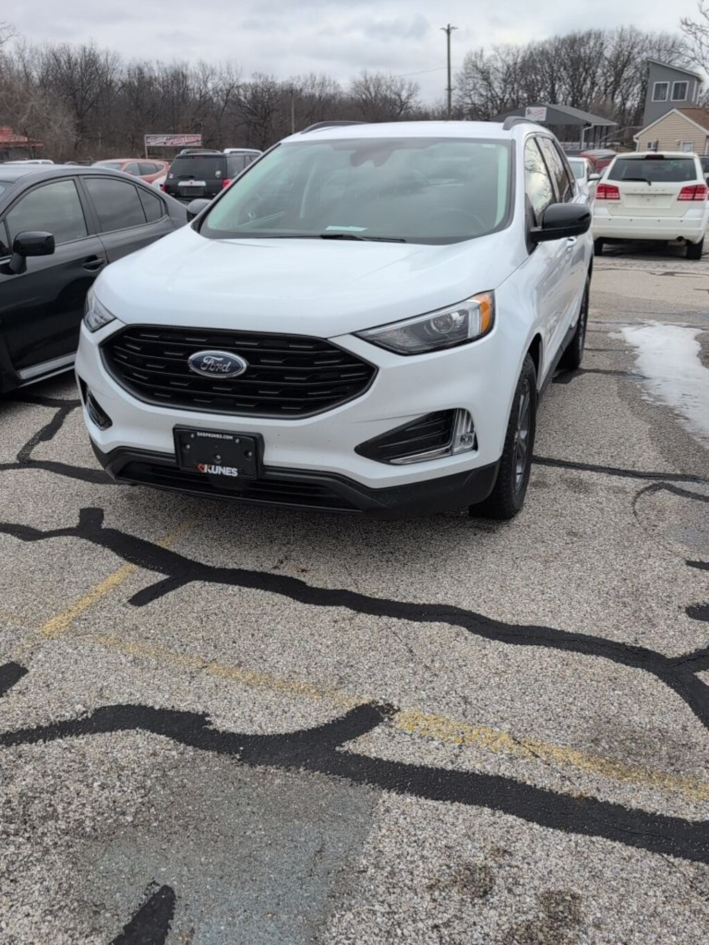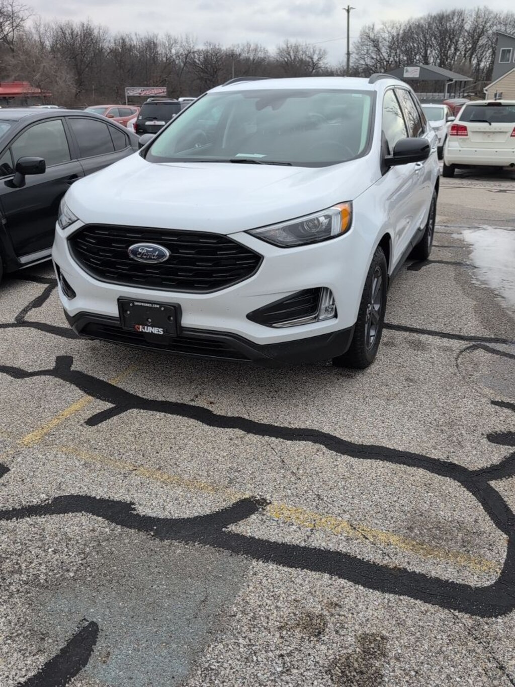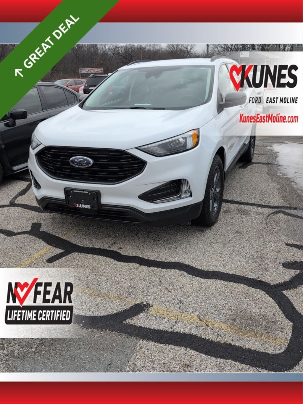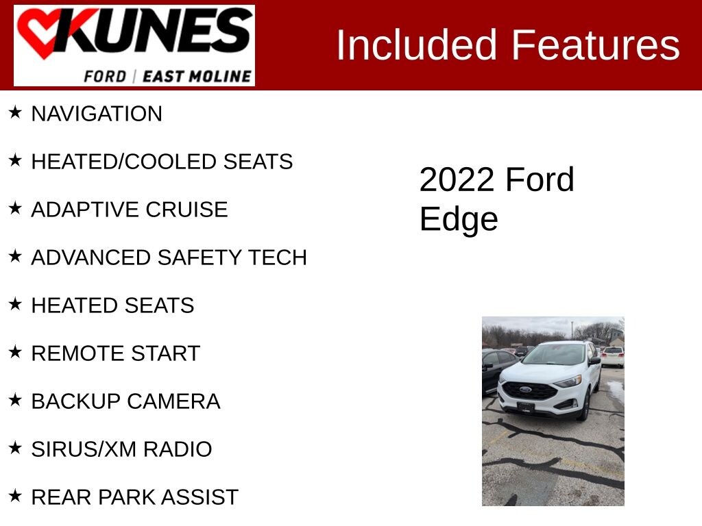 2022 Ford Edge SEL Oxford White EcoBoost 2.0L I4 GTDi DOHC Turbocharged VCT Clean CARFAX. NAVIGATION, HEATED/COOLED SEATS, ADAPTIVE CRUISE, ADVANCED SAFETY TECH, HEATED SEATS, REMOTE START, BACKUP CAMERA, SIRUS/XM RADIO, REAR PARK ASSIST, BLUETOOTH, ** BACK UP CAMERA, ** BLUETOOTH, AWD, 110V/150W AC Power Outlet, ActiveX Seating Material Heated Bucket Seats (513), Auto-dimming Rear-View mirror, Fog Lamps w/Chrome Bezel, Rear reading lights, Steering wheel mounted audio controls. 21/28 City/Highway MPG