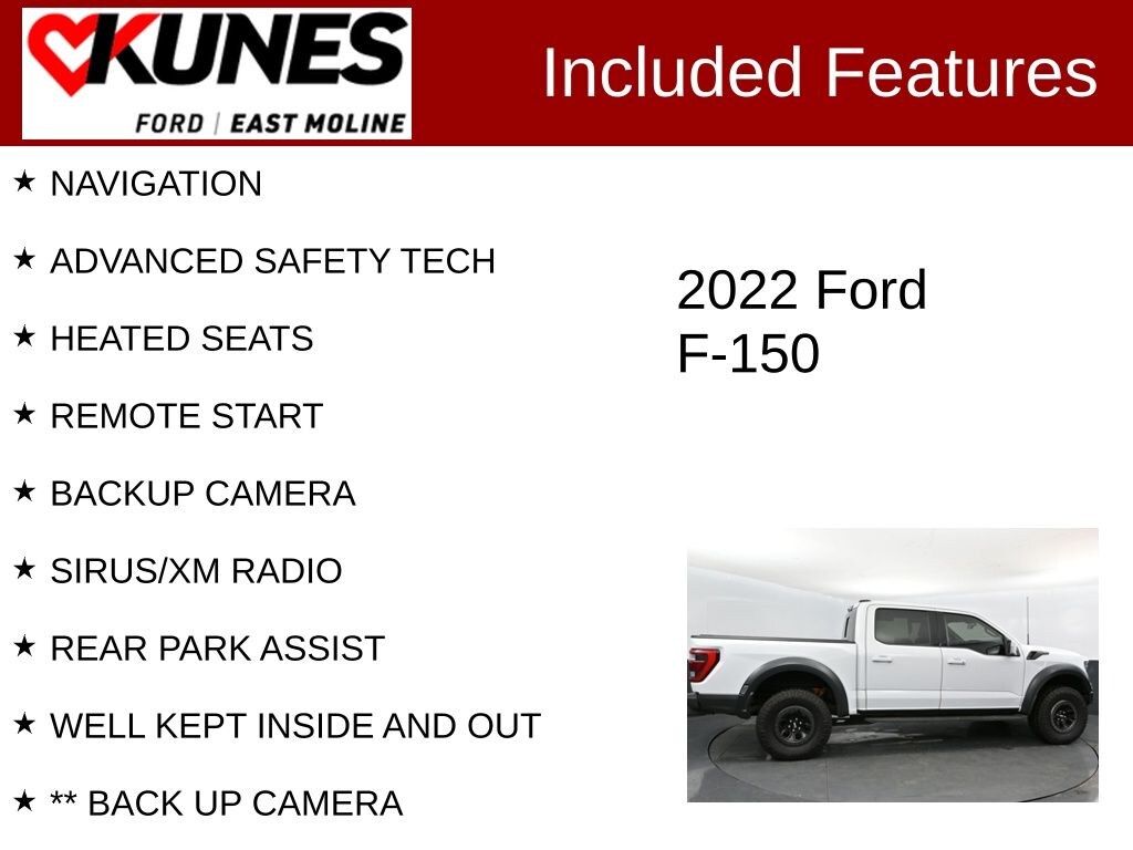 2022 Ford F-150 Raptor Oxford White 3.5L V6 EcoBoost NAVIGATION, ADVANCED SAFETY TECH, HEATED SEATS, REMOTE START, BACKUP CAMERA, SIRUS/XM RADIO, REAR PARK ASSIST, WELL KEPT INSIDE AND OUT, ** BACK UP CAMERA, 4WD, 17" Cast Aluminum Wheels, 4-Wheel Disc Brakes, 7 Speakers, ABS brakes, Adaptive suspension, Adjustable pedals, Auto-dimming door mirrors, Auto-dimming Rear-View mirror, Automatic temperature control, Brake assist, Compass, Connected Built-In Navigation, Delay-off headlights, Driver door bin, Driver vanity mirror, Dual front side impact airbags, Electronic Stability Control, Emergency communication system, Forward Sensing System, Front anti-roll bar, Front Center Armrest, Front dual zone A/C, Front reading lights, Front wheel independent suspension, Fully automatic headlights, Heated door mirrors, Heated Steering Wheel, Illuminated entry, Lane Departure Warning System, LED Projector w/Dynamic Bending Headlamps, Low tire pressure warning, Memory seat, Occupant sensing airbag, Outside temperature display, Overhead airbag, Overhead console, Passenger door bin, Passenger vanity mirror, Pedal memory, Power door mirrors, Power driver seat, Power passenger seat, Power steering, Power Tilt/Telescoping Steering Column w/Memory, Power windows, Radio data system, Radio: AM/FM SiriusXM w/360L, Rain-Sensing Wipers, Raptor Carbon Fiber Package, Rear reading lights, Rear step bumper, Rear window defroster, Remote keyless entry, Rigid LED Fog Lamp, Speed control, Speed-sensing steering, Split folding rear seat, Steering wheel mounted audio controls, Tachometer, Telescoping steering wheel, Tilt steering wheel, Traction control, Trip computer, Turn signal indicator mirrors, Universal Garage Door Opener.