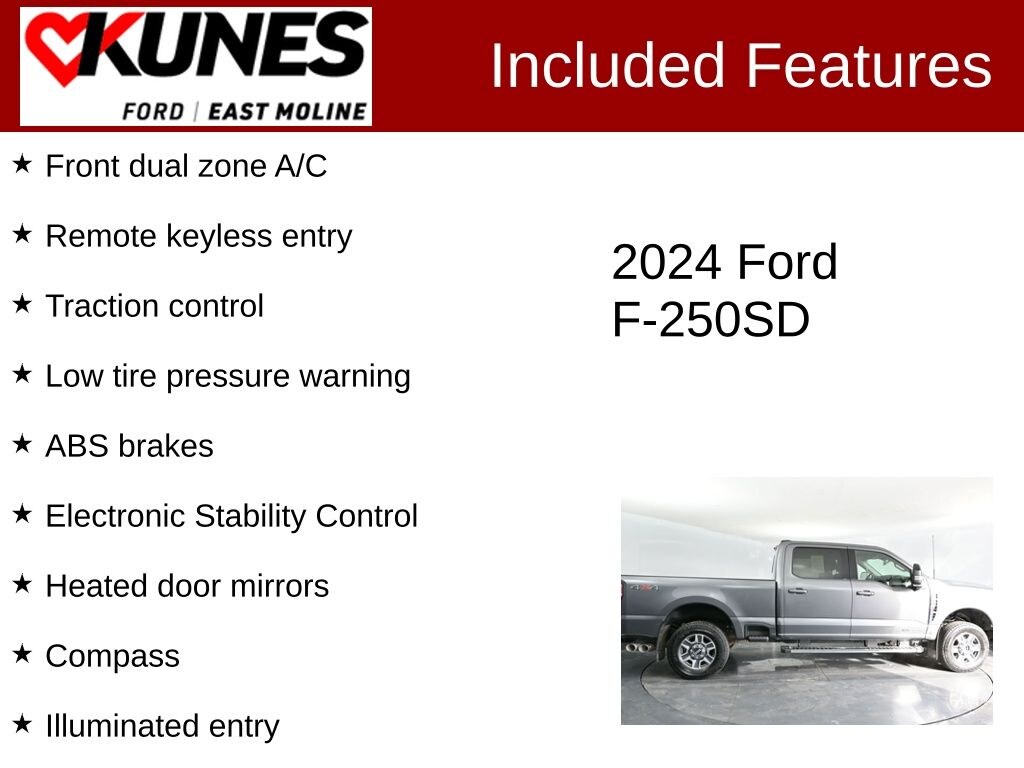2024 Ford F-250SD Lariat Carbonized Gray Metallic Power Stroke 6.7L V8 DI 32V OHV Turbodiesel 4WD, ABS brakes, Alloy wheels, Compass, Electronic Stability Control, Front dual zone A/C, Heated door mirrors, Heated front seats, Heated rear seats, Illuminated entry, Low tire pressure warning, Remote keyless entry, Traction control.